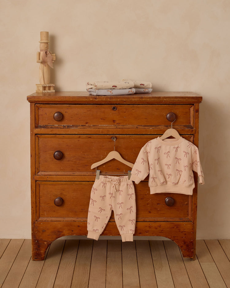 Featuring a ‘red bows’ print on a 'antique' hue.