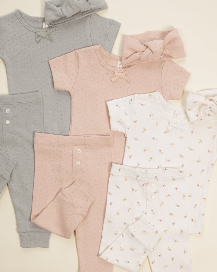 This sweet pointelle set features a short sleeve shirt and leggings with an elastic waistband and faux shell buttons at center front.